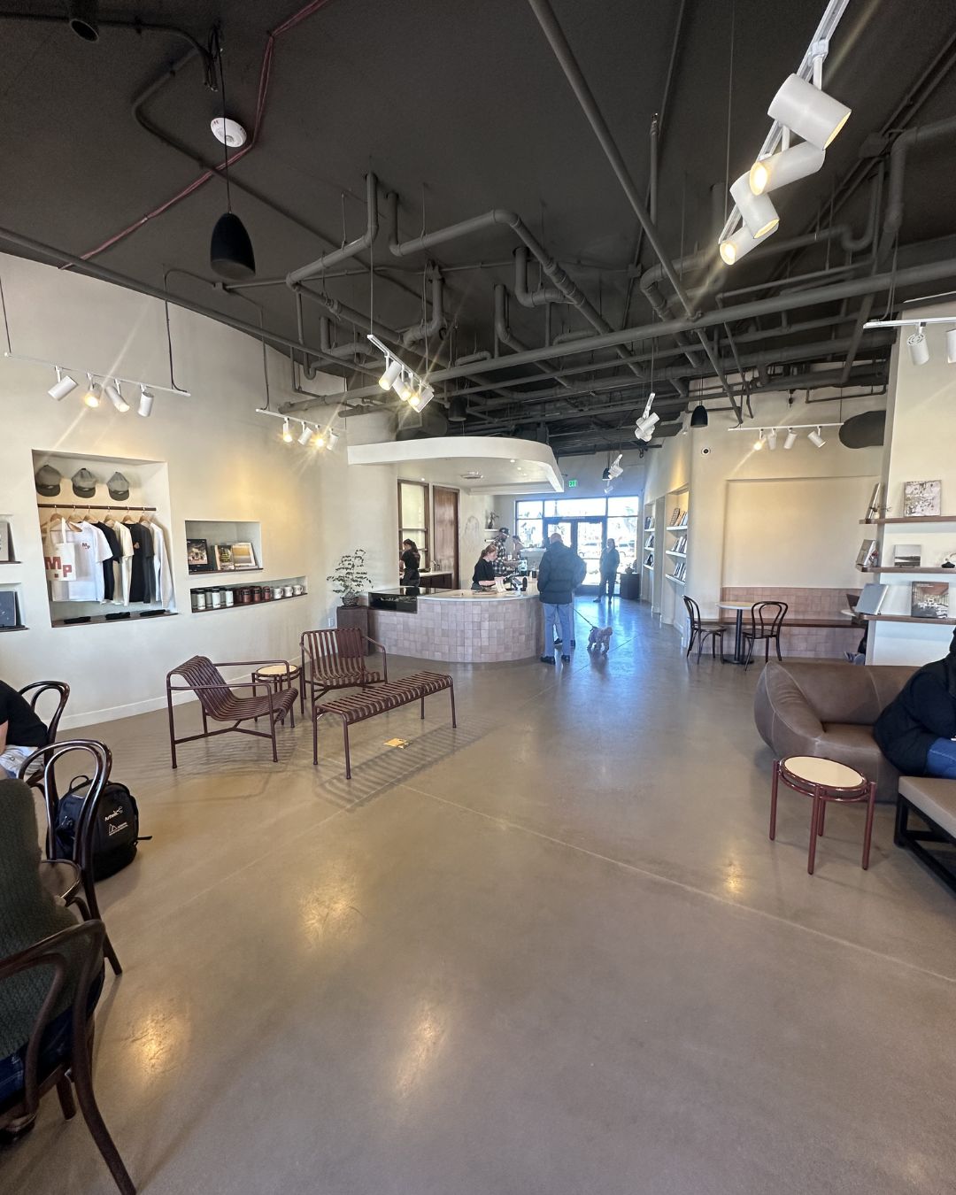 The space leans minimal and design-forward rather than the typical cozy coffee shop. Concrete floors, clean lines, walnut shelving, and curated books give it more of a European café or gallery vibe than a laptop-packed workspace.